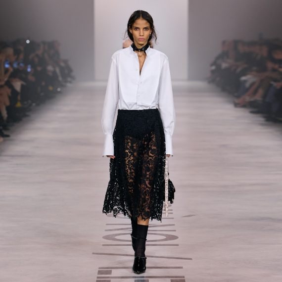 Completi, total black gilet con dettagli furry e abiti in pizzo sfilano alla Milano Fashion Week sulla passerella Autunno/Inverno 2026-2027 di Fendi