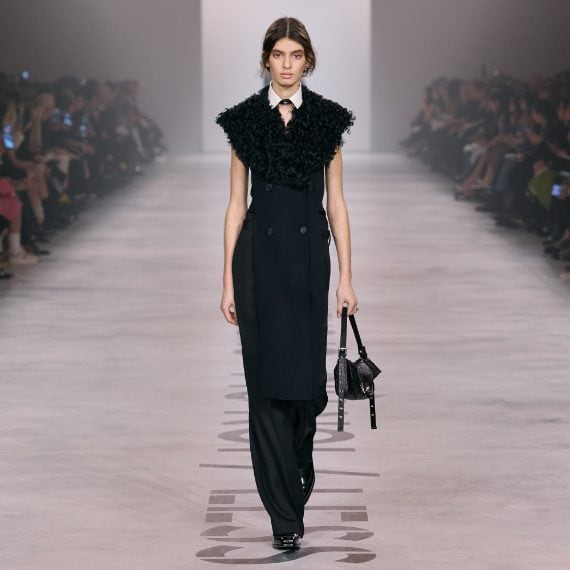 Completi, total black gilet con dettagli furry e abiti in pizzo sfilano alla Milano Fashion Week sulla passerella Autunno/Inverno 2026-2027 di Fendi
