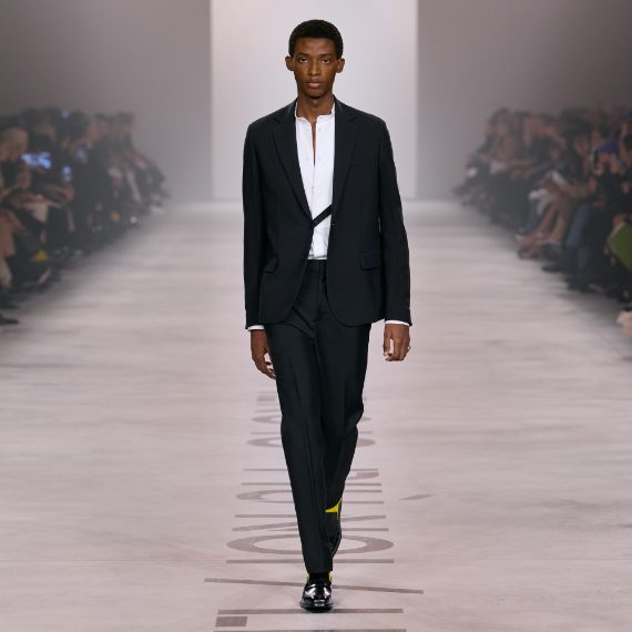 Completi, total black gilet con dettagli furry e abiti in pizzo sfilano alla Milano Fashion Week sulla passerella Autunno/Inverno 2026-2027 di Fendi