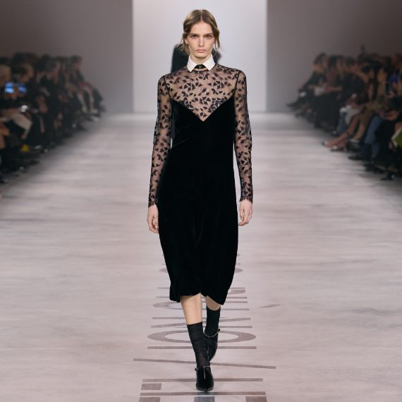 Completi, total black gilet con dettagli furry e abiti in pizzo sfilano alla Milano Fashion Week sulla passerella Autunno/Inverno 2026-2027 di Fendi