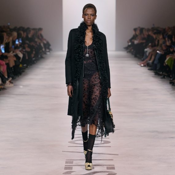Completi, total black gilet con dettagli furry e abiti in pizzo sfilano alla Milano Fashion Week sulla passerella Autunno/Inverno 2026-2027 di Fendi