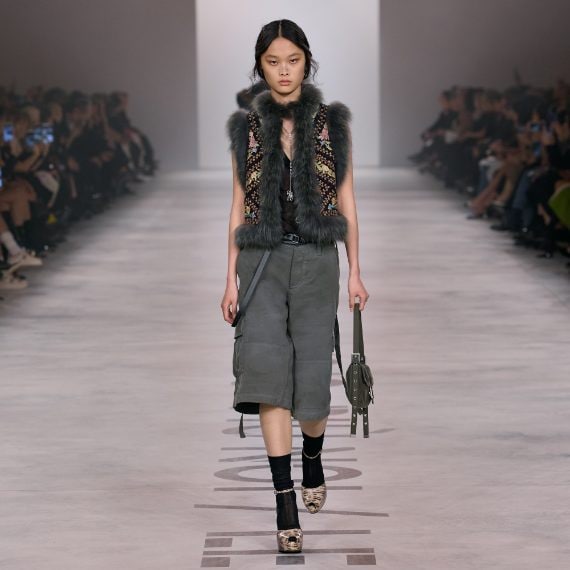 Completi, total black gilet con dettagli furry e abiti in pizzo sfilano alla Milano Fashion Week sulla passerella Autunno/Inverno 2026-2027 di Fendi