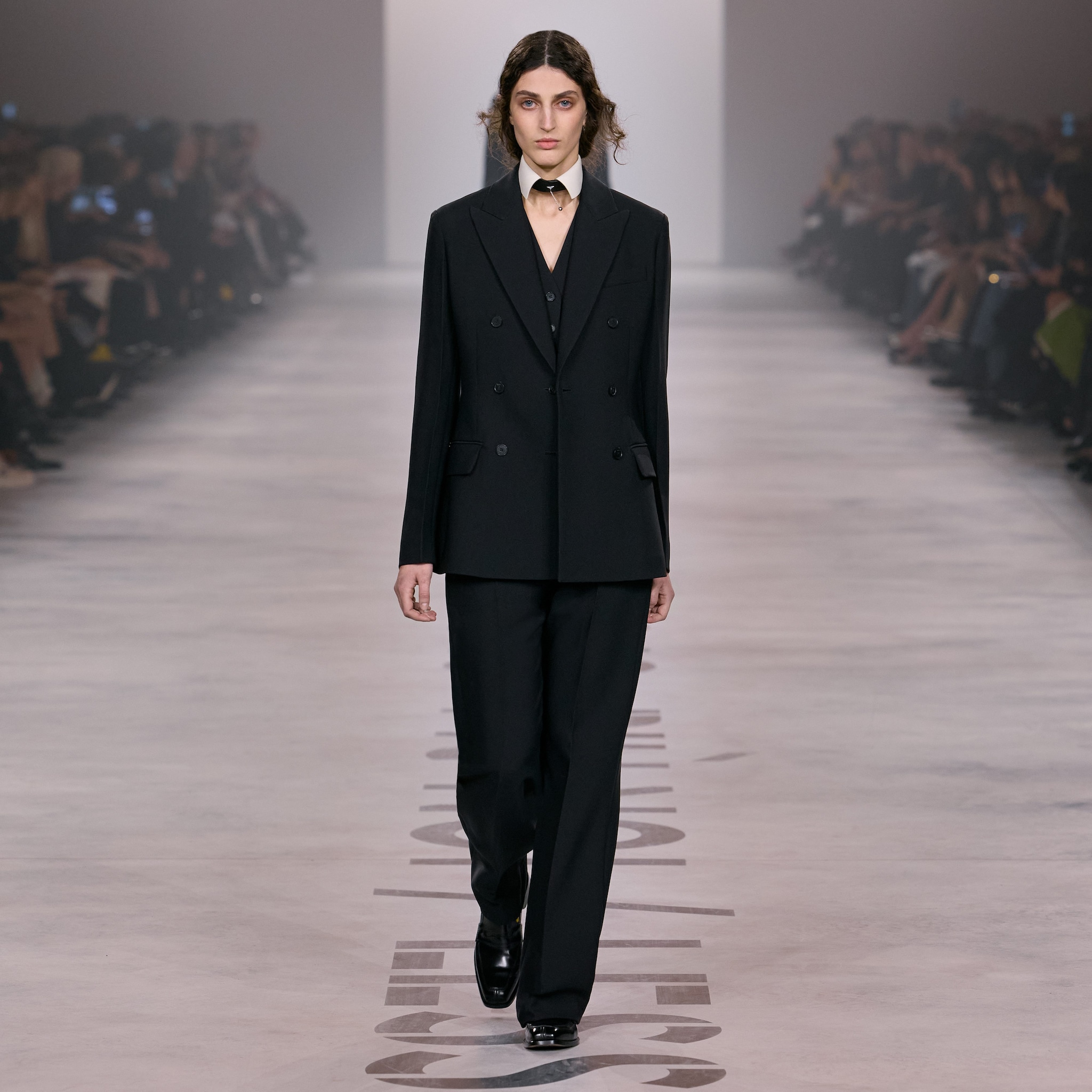 Completi, total black gilet con dettagli furry e abiti in pizzo sfilano alla Milano Fashion Week sulla passerella Autunno/Inverno 2026-2027 di Fendi