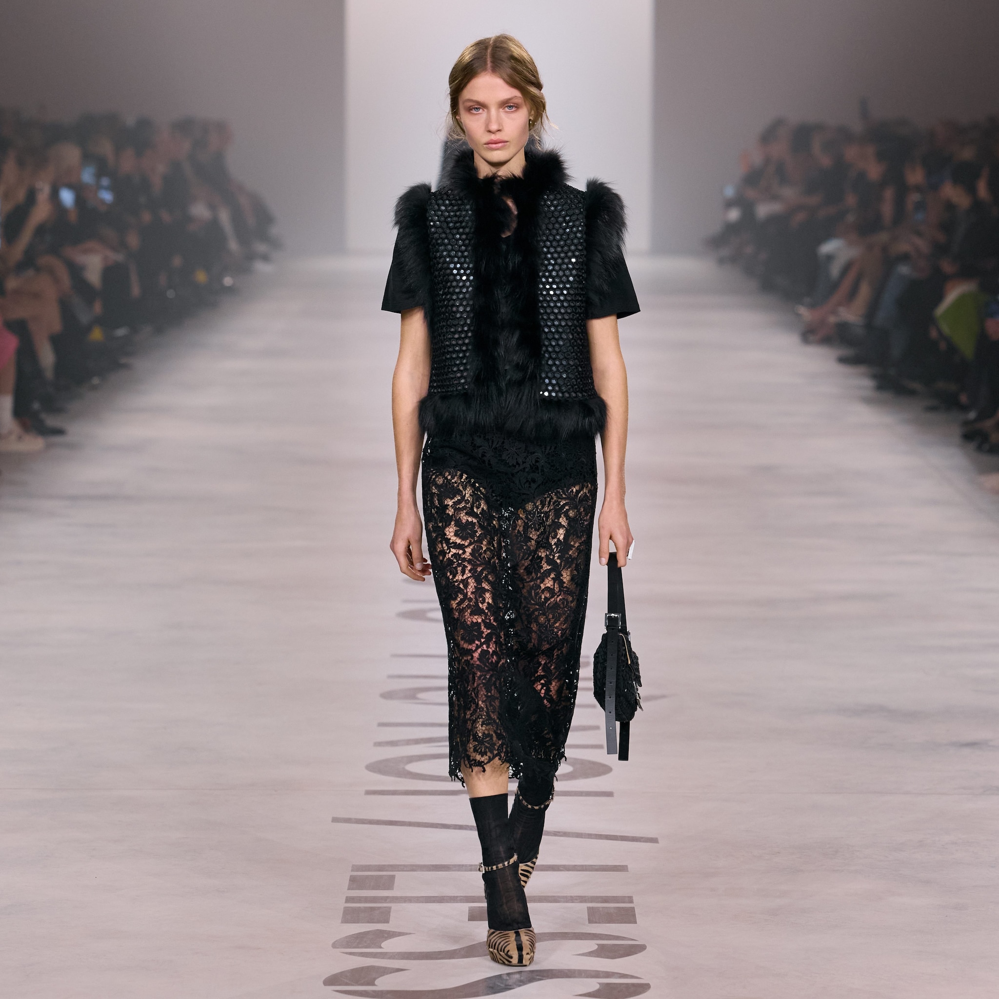 Completi, total black gilet con dettagli furry e abiti in pizzo sfilano alla Milano Fashion Week sulla passerella Autunno/Inverno 2026-2027 di Fendi