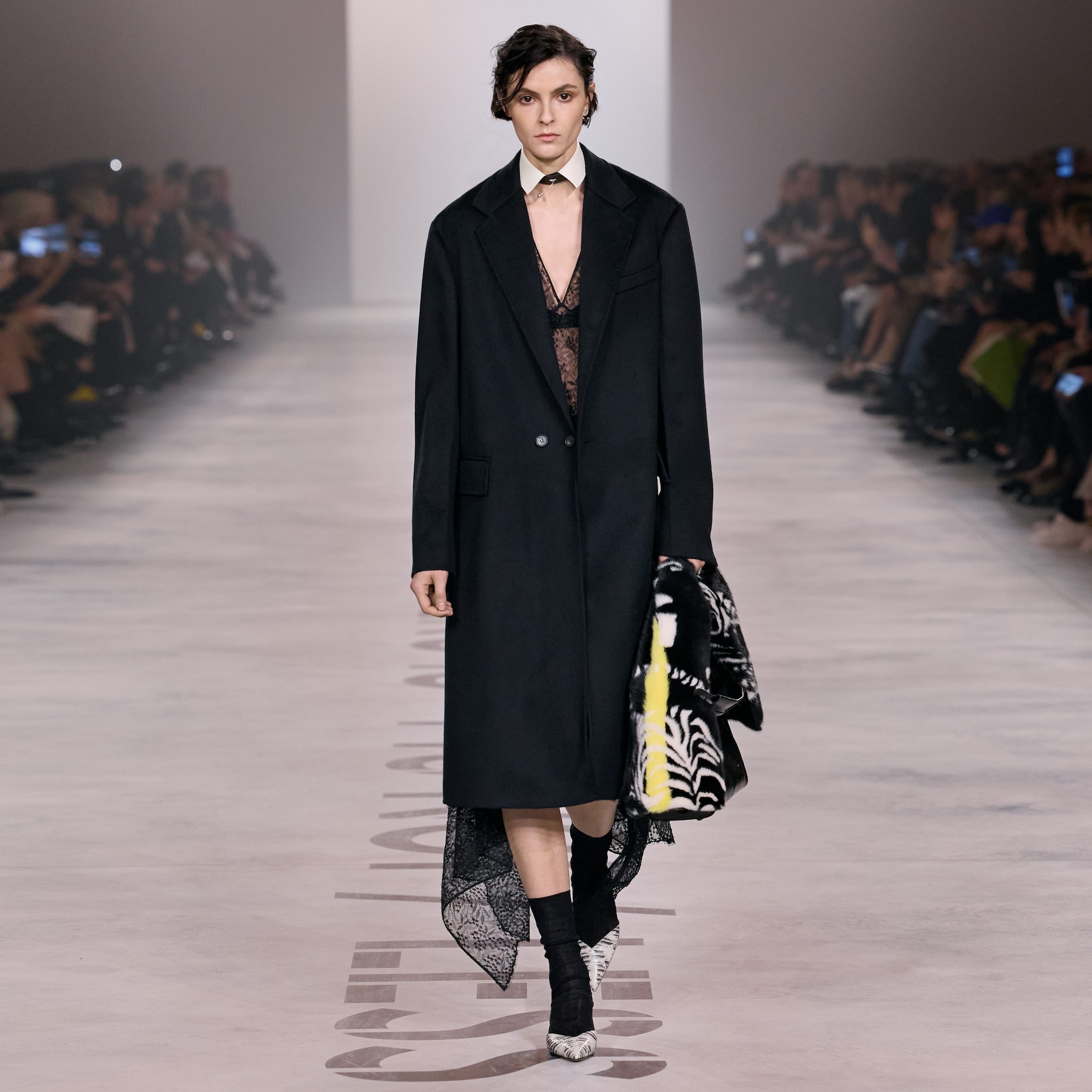 Completi, total black gilet con dettagli furry e abiti in pizzo sfilano alla Milano Fashion Week sulla passerella Autunno/Inverno 2026-2027 di Fendi