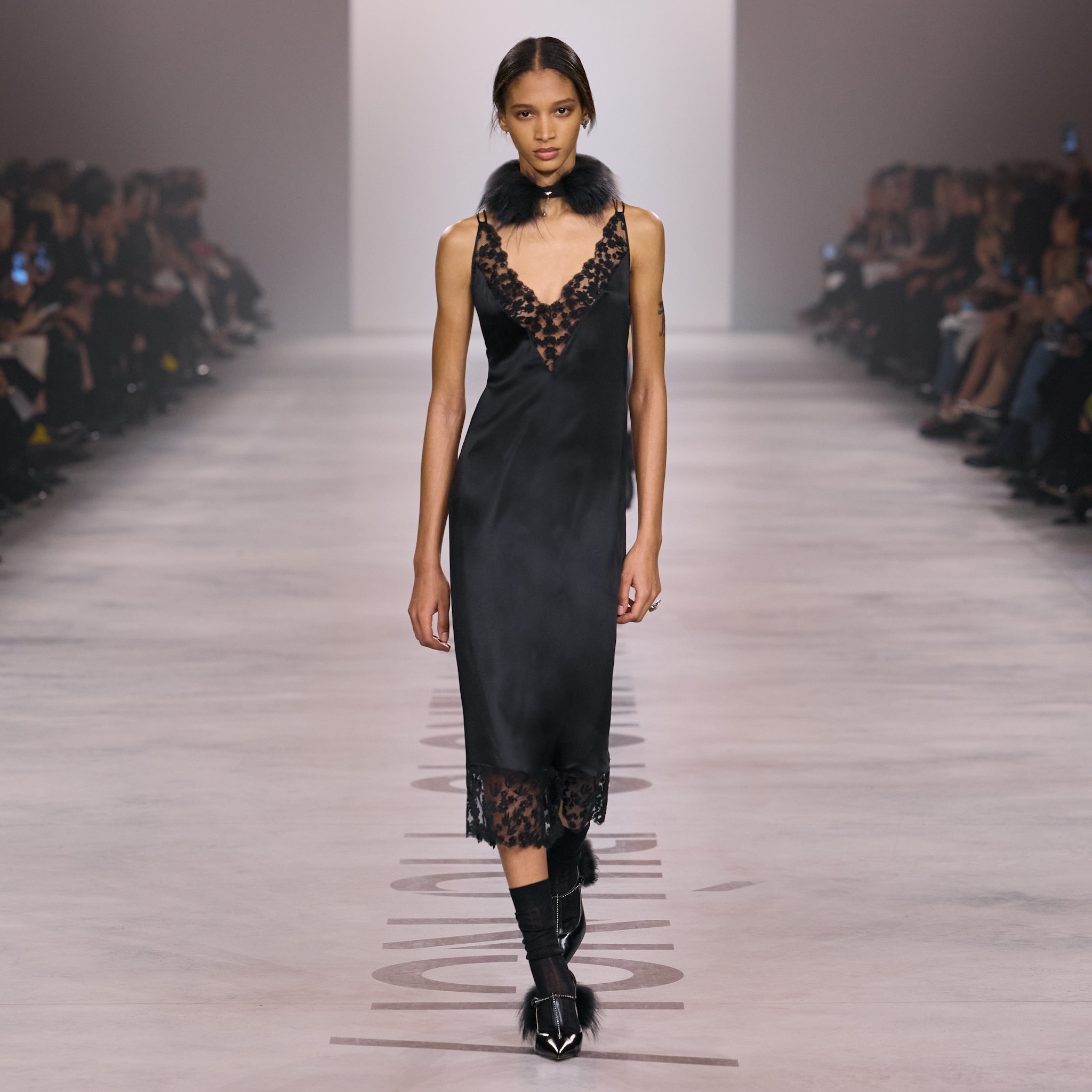 Completi, total black gilet con dettagli furry e abiti in pizzo sfilano alla Milano Fashion Week sulla passerella Autunno/Inverno 2026-2027 di Fendi