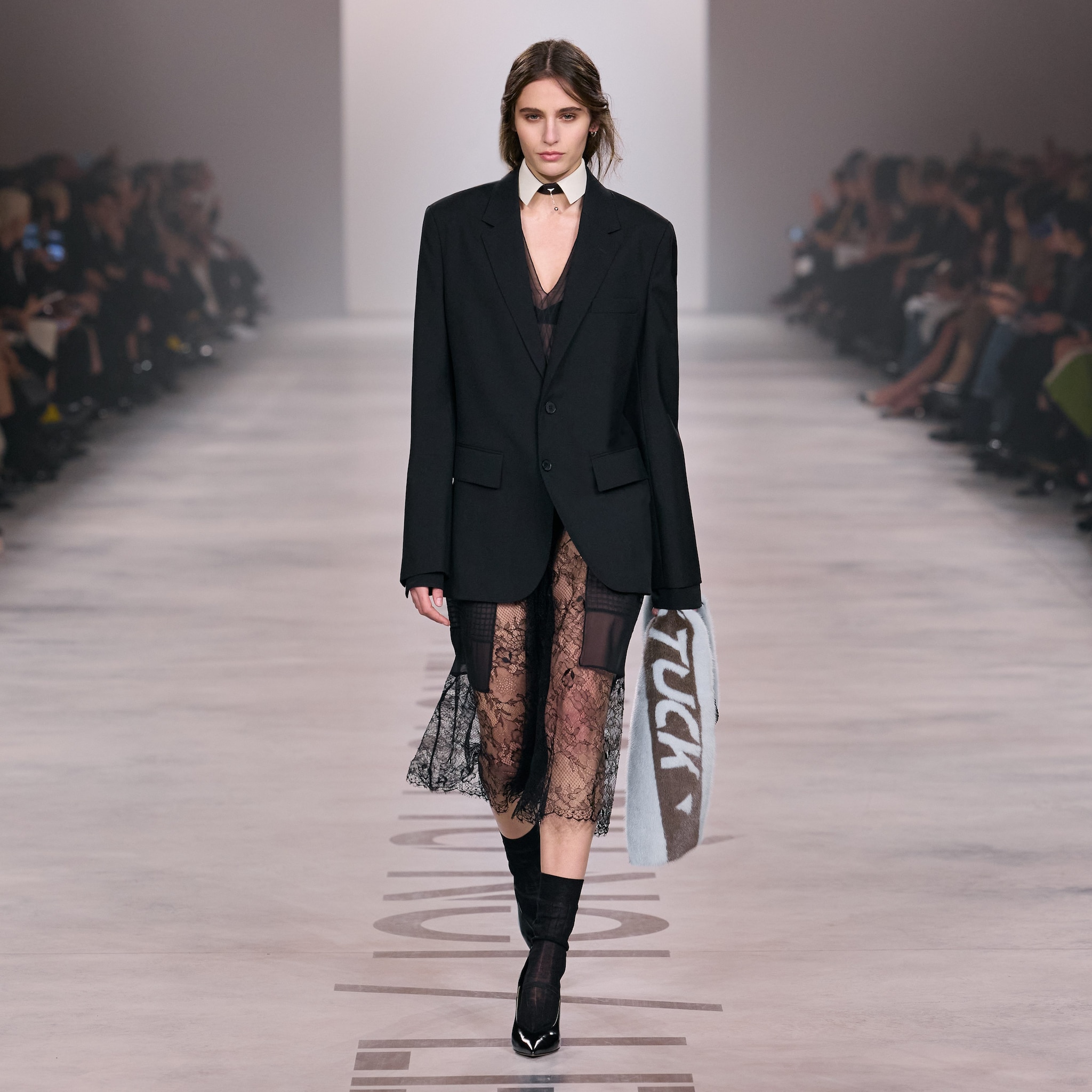 Completi, total black gilet con dettagli furry e abiti in pizzo sfilano alla Milano Fashion Week sulla passerella Autunno/Inverno 2026-2027 di Fendi