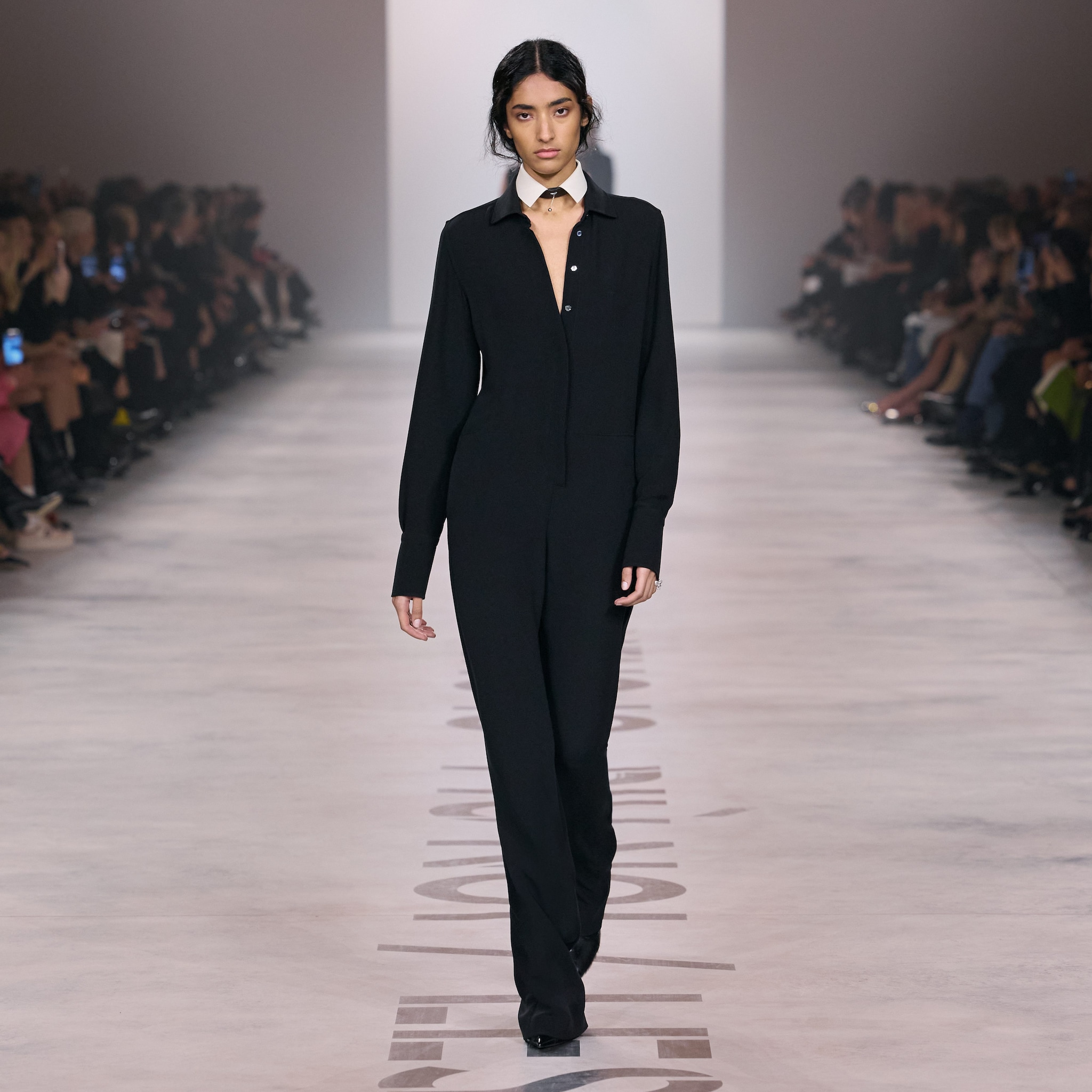 Completi, total black gilet con dettagli furry e abiti in pizzo sfilano alla Milano Fashion Week sulla passerella Autunno/Inverno 2026-2027 di Fendi