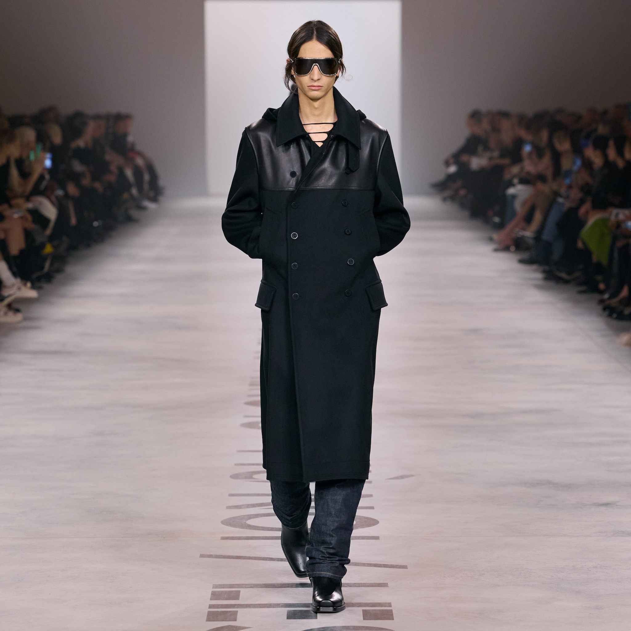 Completi, total black gilet con dettagli furry e abiti in pizzo sfilano alla Milano Fashion Week sulla passerella Autunno/Inverno 2026-2027 di Fendi