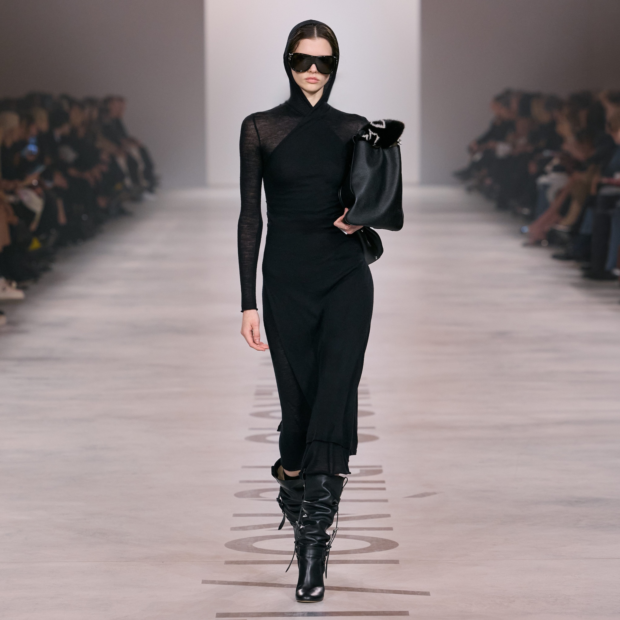 Completi, total black gilet con dettagli furry e abiti in pizzo sfilano alla Milano Fashion Week sulla passerella Autunno/Inverno 2026-2027 di Fendi