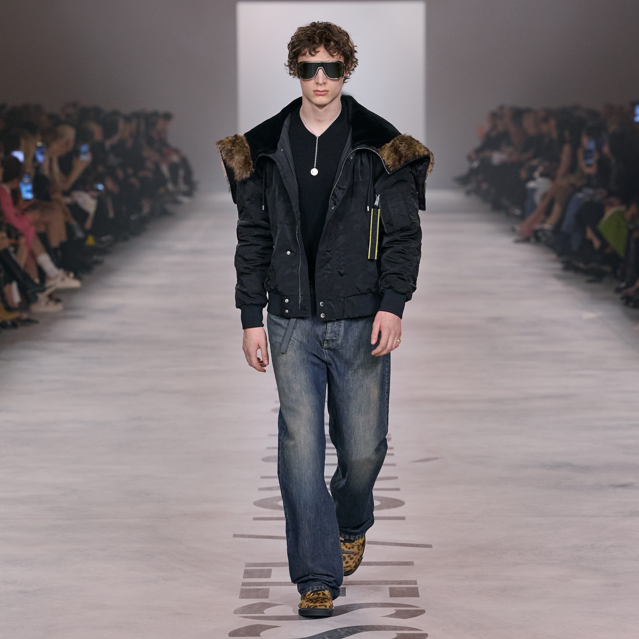 Completi, total black gilet con dettagli furry e abiti in pizzo sfilano alla Milano Fashion Week sulla passerella Autunno/Inverno 2026-2027 di Fendi