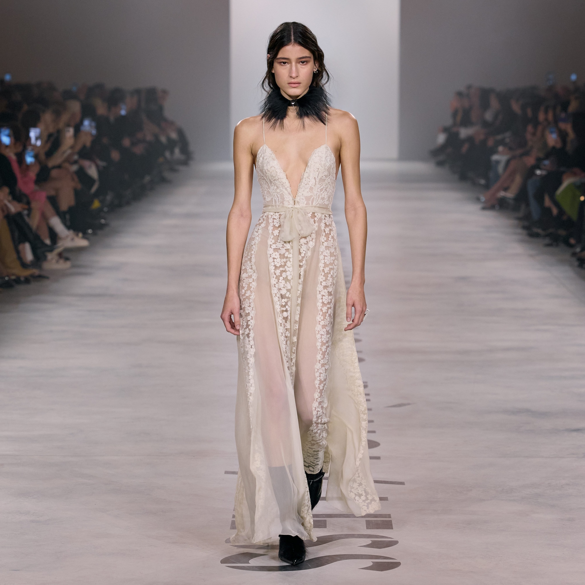 Completi, total black gilet con dettagli furry e abiti in pizzo sfilano alla Milano Fashion Week sulla passerella Autunno/Inverno 2026-2027 di Fendi