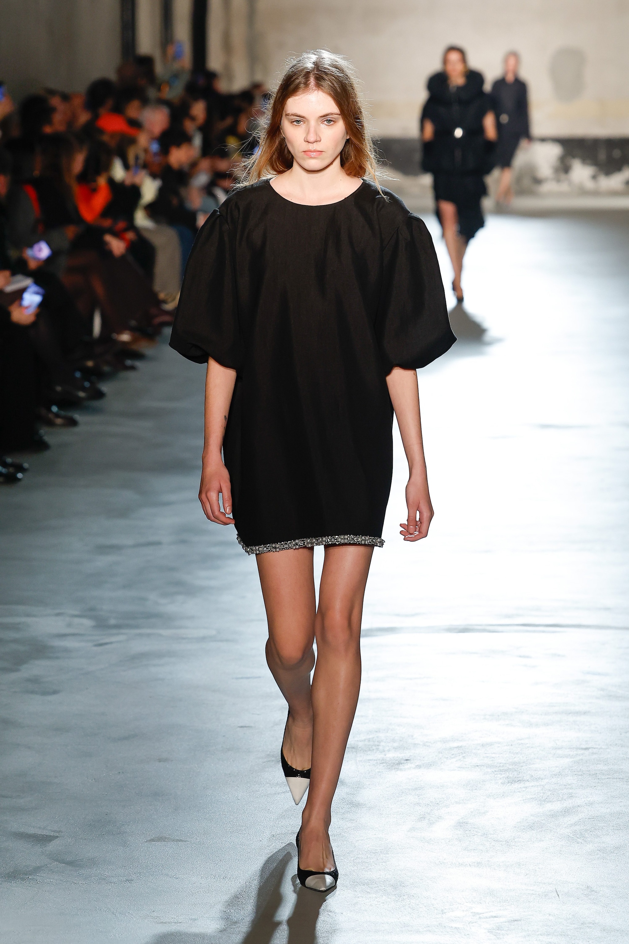 Abiti neri si alternano a capi argentati o in tessuto rosso e ancora bomber in pelle e vestiti coperti di paillettes sfilano alla Milano Fashion Week sulla passerella Autunno/Inverno 2026-2027 di N21.