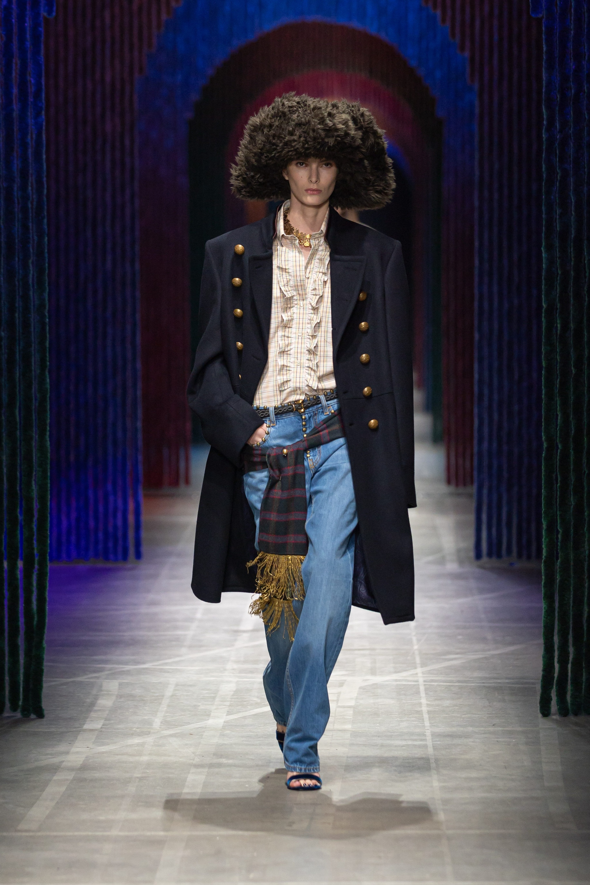 Cappotti e blazer d'ispirazione militare, mescolati con maxi pull dalle intricate lavorazioni e con abiti foulard, sfilano alla Milano Fashion Week sulla passerella Autunno/Inverno 2026-2027 di Etro.