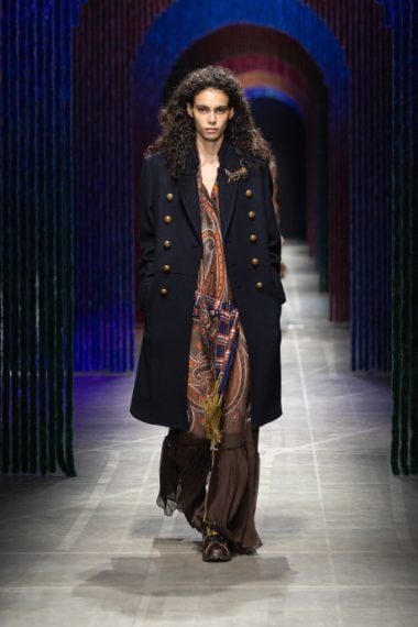 Cappotti e blazer d'ispirazione militare, mescolati con maxi pull dalle intricate lavorazioni e con abiti foulard, sfilano alla Milano Fashion Week sulla passerella Autunno/Inverno 2026-2027 di Etro.