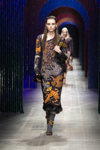 Cappotti e blazer d'ispirazione militare, mescolati con maxi pull dalle intricate lavorazioni e con abiti foulard, sfilano alla Milano Fashion Week sulla passerella Autunno/Inverno 2026-2027 di Etro.