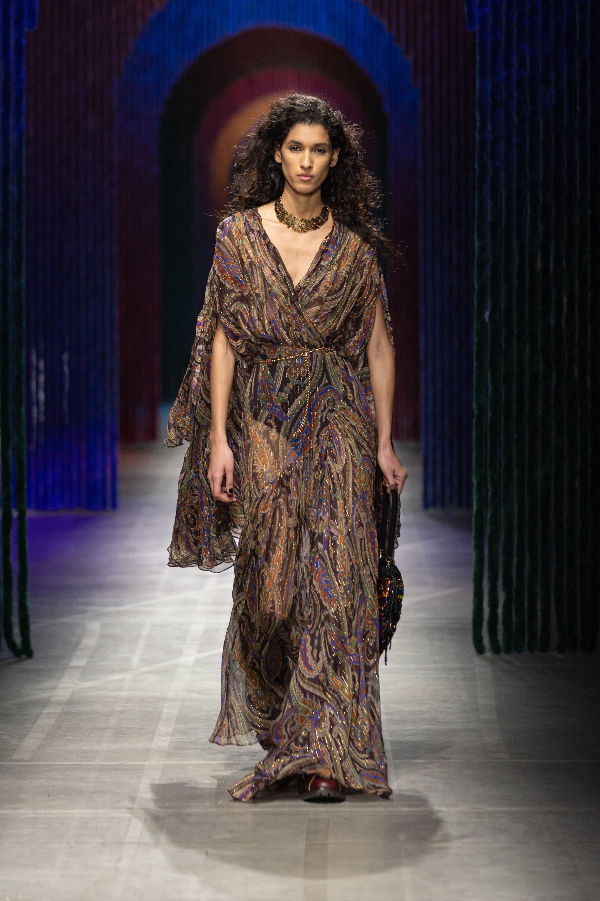 Cappotti e blazer d'ispirazione militare, mescolati con maxi pull dalle intricate lavorazioni e con abiti foulard, sfilano alla Milano Fashion Week sulla passerella Autunno/Inverno 2026-2027 di Etro.