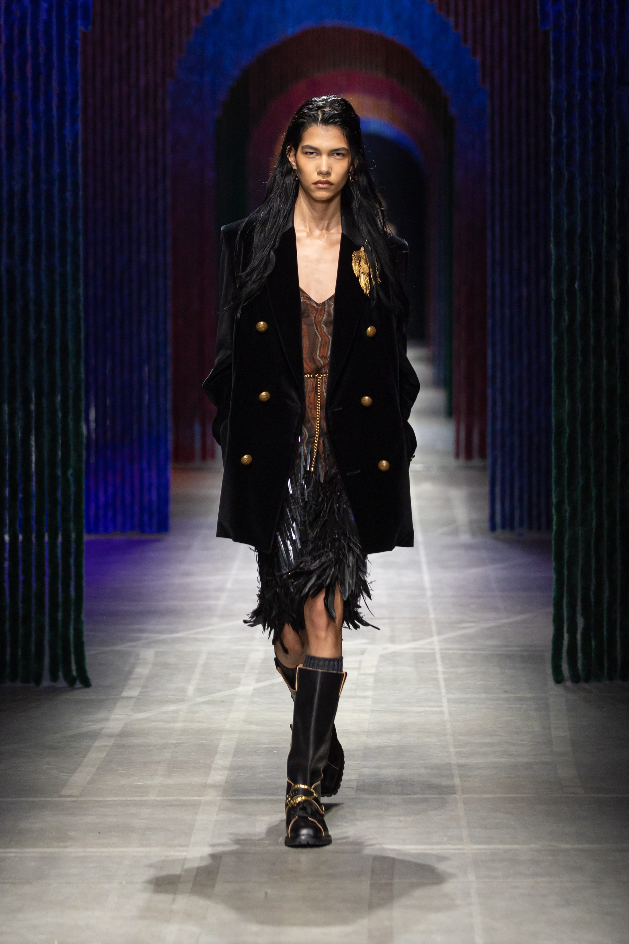 Cappotti e blazer d'ispirazione militare, mescolati con maxi pull dalle intricate lavorazioni e con abiti foulard, sfilano alla Milano Fashion Week sulla passerella Autunno/Inverno 2026-2027 di Etro.