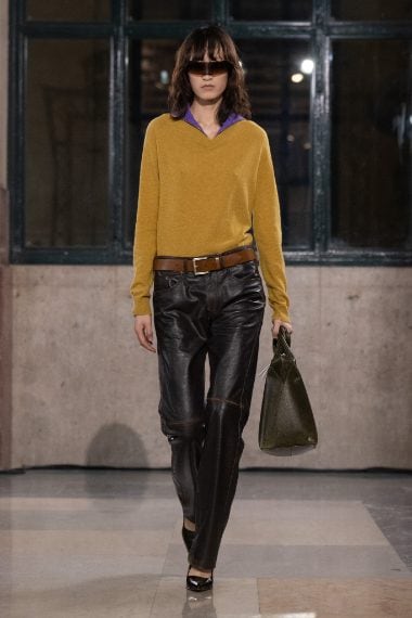 Mini abiti in maglia e pullover che sembrano felpe, look formali con gonne a tubo e outfit in total pelle sfilano alla Milano Fashion Week sulla passerella Autunno/Inverno 2026-2027 di MM6 Maison Margiela.
