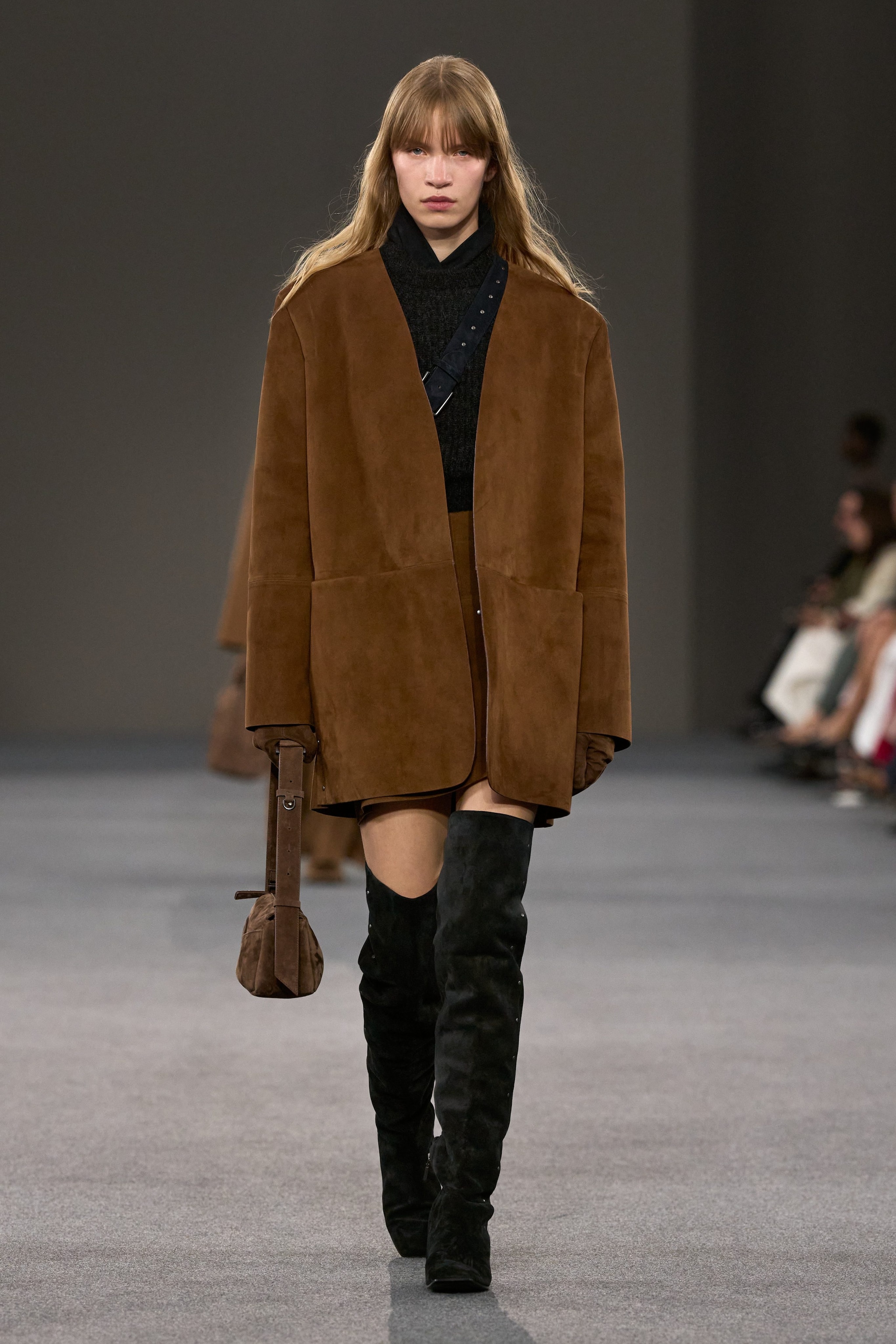 Cappotti e blazer con inserti in suede, linee pulite e abiti in maglia sfilano alla Milano Fashion Week sulla passerella Autunno/Inverno 2026-2027 di Max Mara