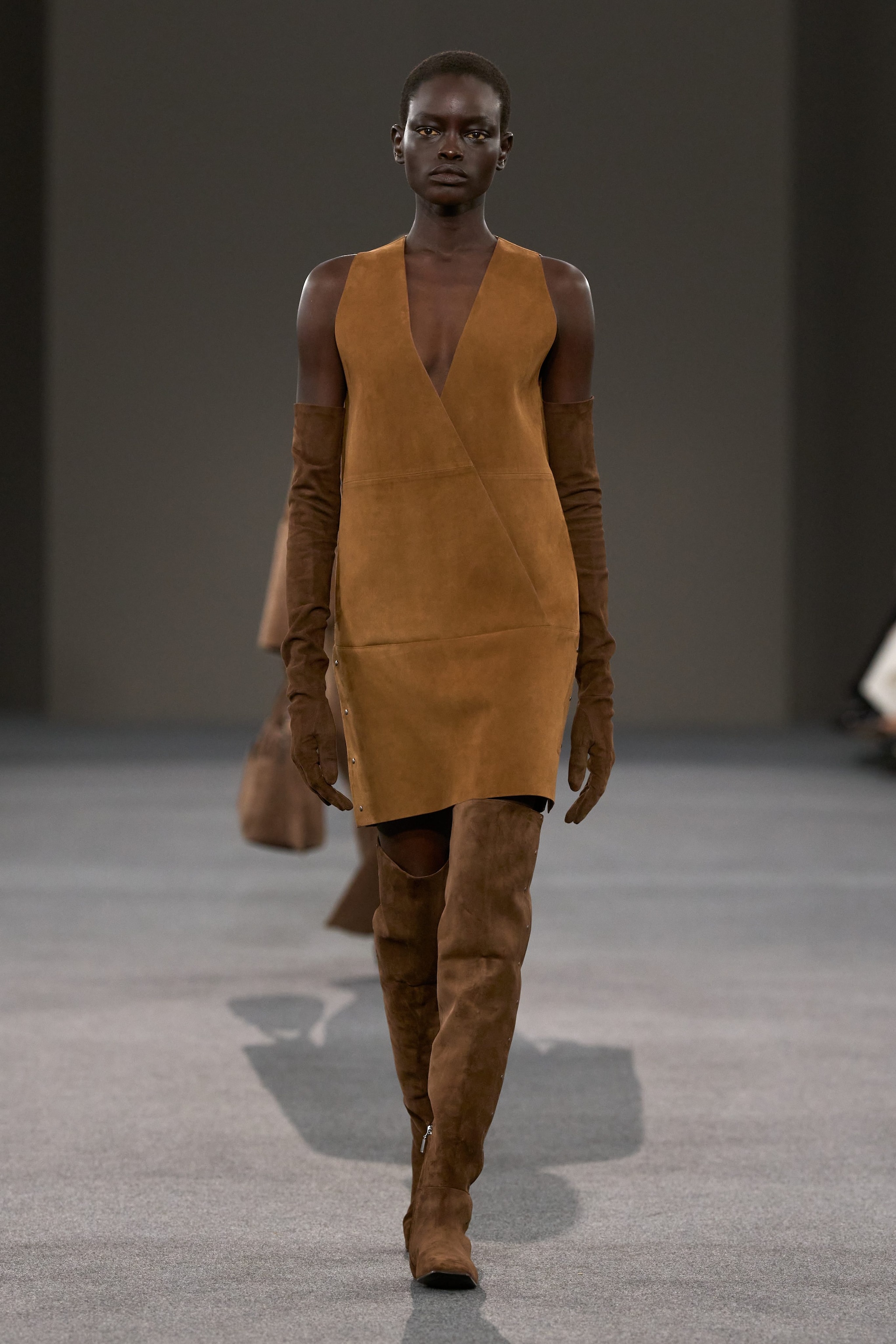 Cappotti e blazer con inserti in suede, linee pulite e abiti in maglia sfilano alla Milano Fashion Week sulla passerella Autunno/Inverno 2026-2027 di Max Mara