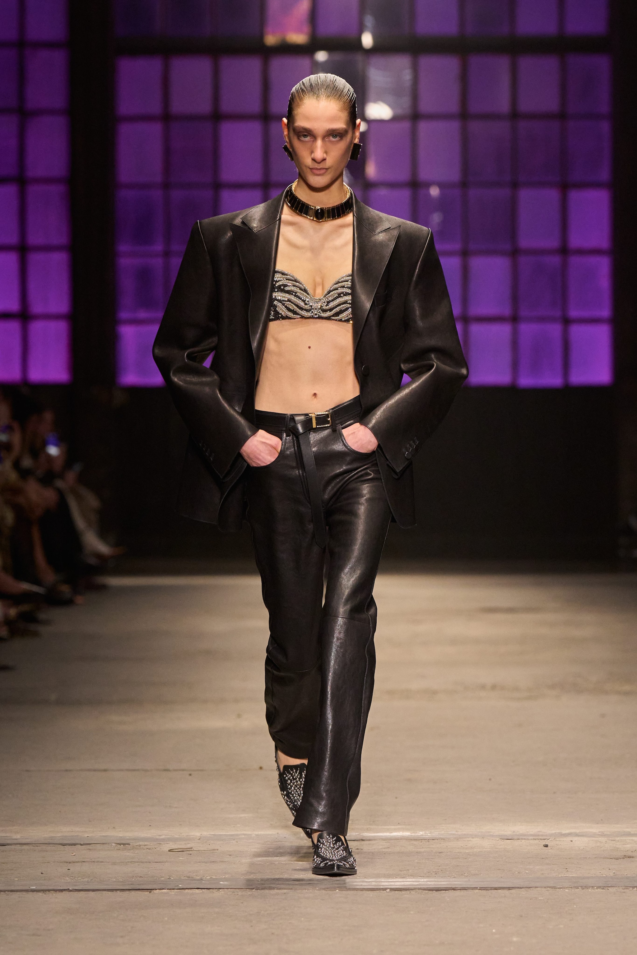 Look in pelle, vernice o in tessuto a effetto cocco, ampie gonne a ruota e giacche crop sfilano alla Milano Fashion Week sulla passerella Autunno/Inverno 2026-2027 di Roberto Cavalli