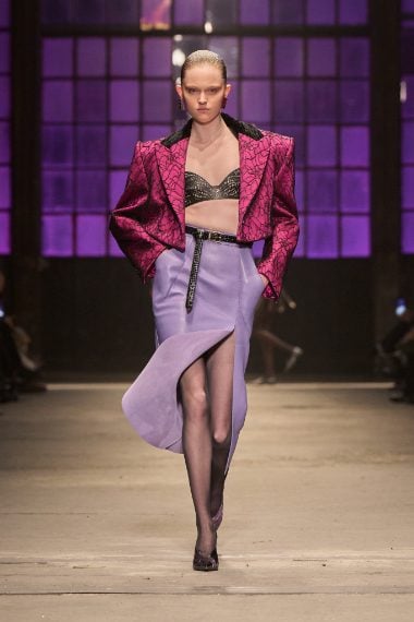 Look in pelle, vernice o in tessuto a effetto cocco, ampie gonne a ruota e giacche crop sfilano alla Milano Fashion Week sulla passerella Autunno/Inverno 2026-2027 di Roberto Cavalli