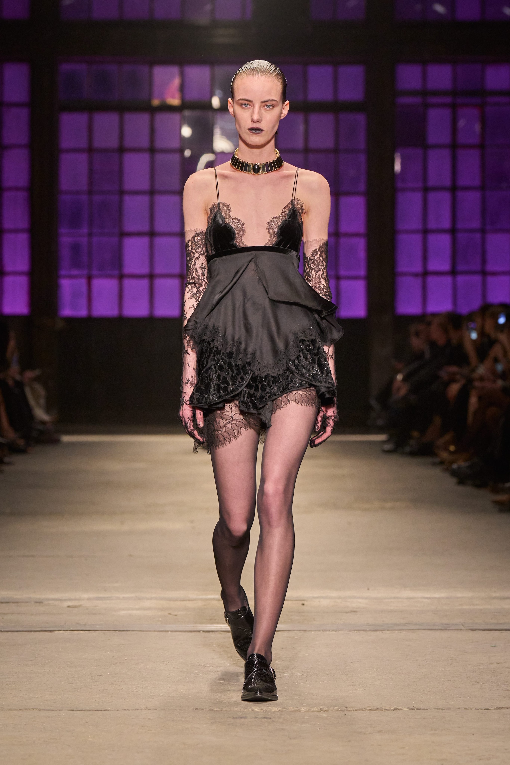 Look in pelle, vernice o in tessuto a effetto cocco, ampie gonne a ruota e giacche crop sfilano alla Milano Fashion Week sulla passerella Autunno/Inverno 2026-2027 di Roberto Cavalli