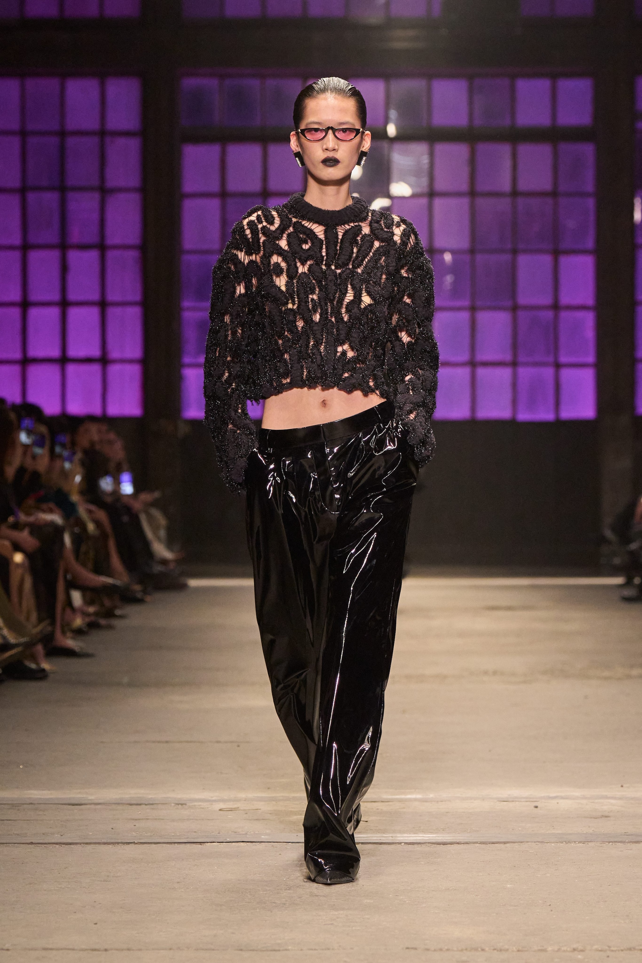 Look in pelle, vernice o in tessuto a effetto cocco, ampie gonne a ruota e giacche crop sfilano alla Milano Fashion Week sulla passerella Autunno/Inverno 2026-2027 di Roberto Cavalli