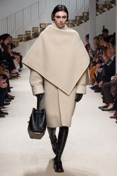 Ampie mantelle in lana, abiti foulard, cappotti furry e blazer dai rever a lancia sfilano alla Milano Fashion Week sulla passerella Autunno/Inverno 2026-2027 di Tod's