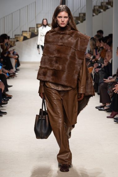 Ampie mantelle in lana, abiti foulard, cappotti furry e blazer dai rever a lancia sfilano alla Milano Fashion Week sulla passerella Autunno/Inverno 2026-2027 di Tod's