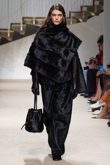 Ampie mantelle in lana, abiti foulard, cappotti furry e blazer dai rever a lancia sfilano alla Milano Fashion Week sulla passerella Autunno/Inverno 2026-2027 di Tod's
