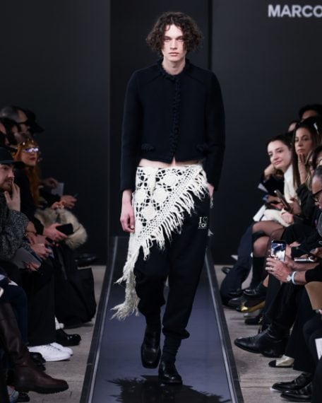 Completi in lana e mini abiti in suede, dettagli crochet e fantasie a cuori sfilano alla Milano Fashion Week sulla passerella Autunno/Inverno 2026-2027 di Marco Rambaldi.