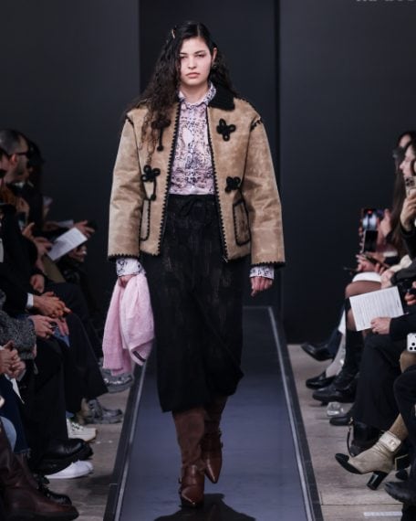 Completi in lana e mini abiti in suede, dettagli crochet e fantasie a cuori sfilano alla Milano Fashion Week sulla passerella Autunno/Inverno 2026-2027 di Marco Rambaldi.
