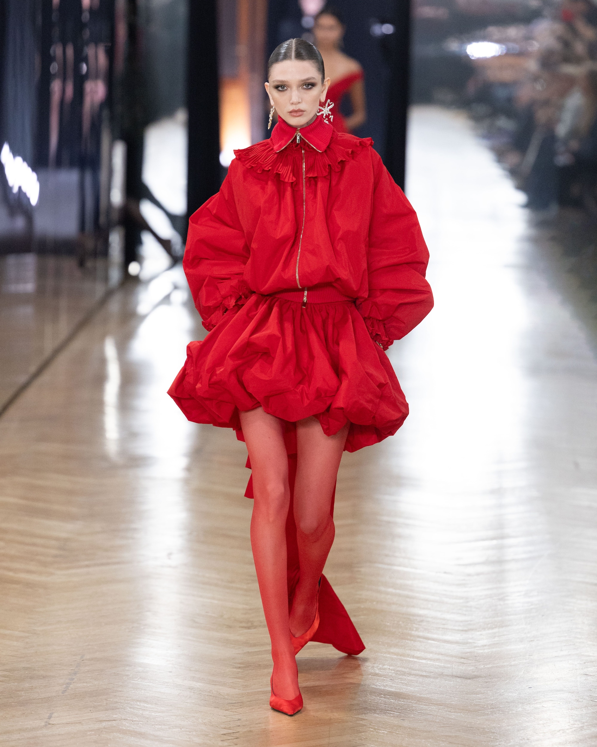 Stampe e ricami floreali, ruche e decori in pizzo sfilano alla Milano Fashion Week sulla passerella Autunno/Inverno 2026-2027 di Blumarine by David Koma
