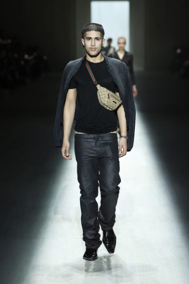 Look in pelle e pantaloni slim fit, marsupi logati e piumini con colli in pelliccia, maxi trench e blazer oversize sfilano alla Milano Fashion Week sulla passerella Autunno/Inverno 2026-2027 di Gucci by Demna.