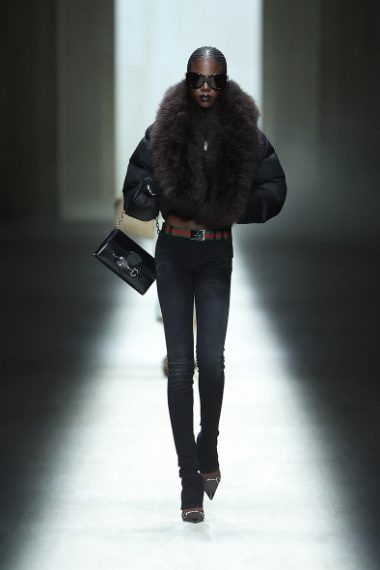 Look in pelle e pantaloni slim fit, marsupi logati e piumini con colli in pelliccia, maxi trench e blazer oversize sfilano alla Milano Fashion Week sulla passerella Autunno/Inverno 2026-2027 di Gucci by Demna.