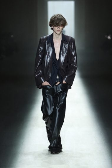 Look in pelle e pantaloni slim fit, marsupi logati e piumini con colli in pelliccia, maxi trench e blazer oversize sfilano alla Milano Fashion Week sulla passerella Autunno/Inverno 2026-2027 di Gucci by Demna.