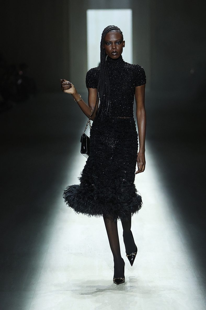 Look in pelle e pantaloni slim fit, marsupi logati e piumini con colli in pelliccia, maxi trench e blazer oversize sfilano alla Milano Fashion Week sulla passerella Autunno/Inverno 2026-2027 di Gucci by Demna.