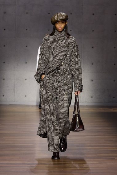 Completi oversize e decorati con fantasie principe di Galles, montoni crop e cappotti in pelle sfilano alla Milano Fashion Week sulla passerella Autunno/Inverno 2026-2027 di Emporio Armani.