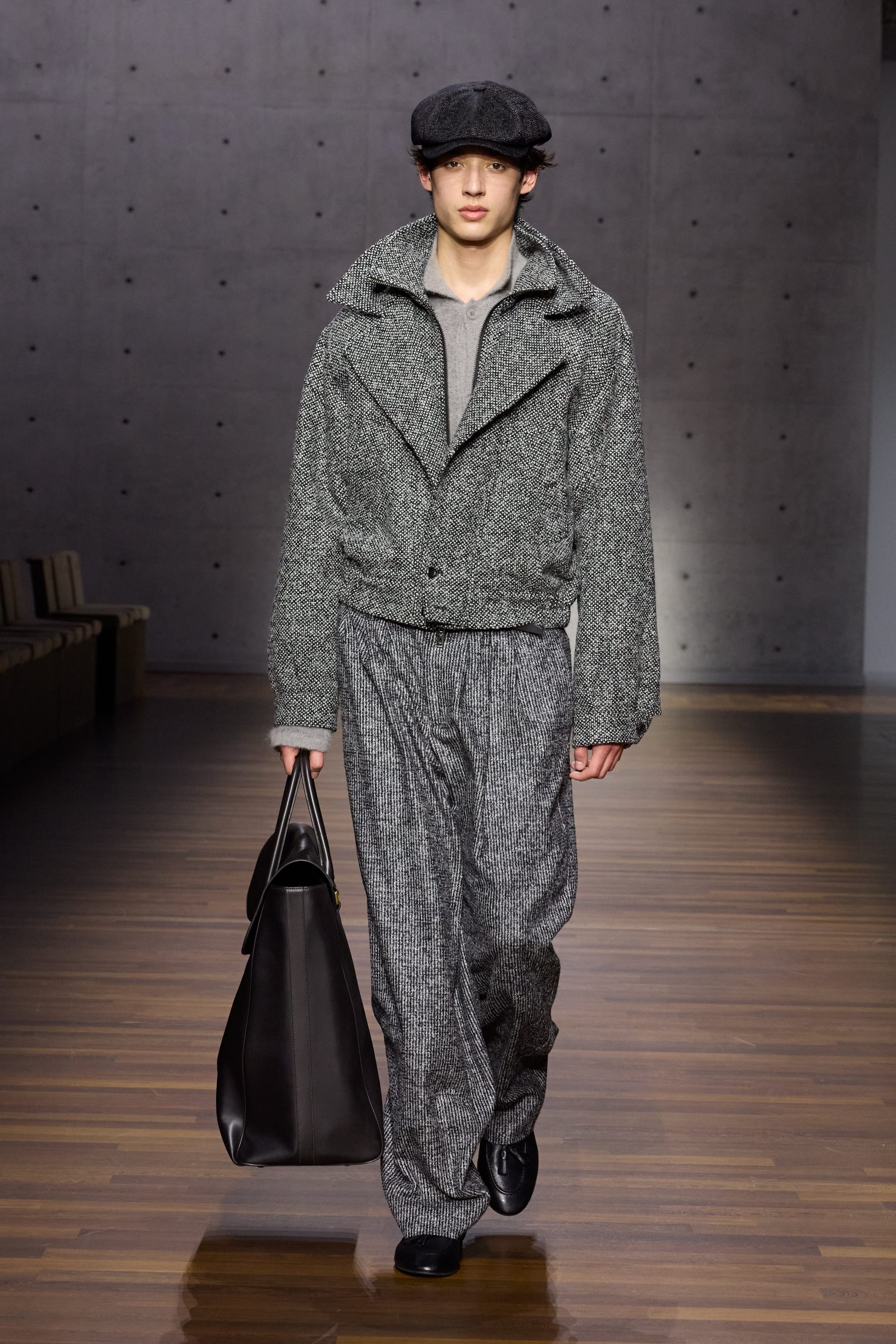 Completi oversize e decorati con fantasie principe di Galles, montoni crop e cappotti in pelle sfilano alla Milano Fashion Week sulla passerella Autunno/Inverno 2026-2027 di Emporio Armani.