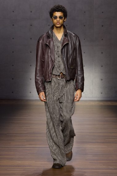 Completi oversize e decorati con fantasie principe di Galles, montoni crop e cappotti in pelle sfilano alla Milano Fashion Week sulla passerella Autunno/Inverno 2026-2027 di Emporio Armani.