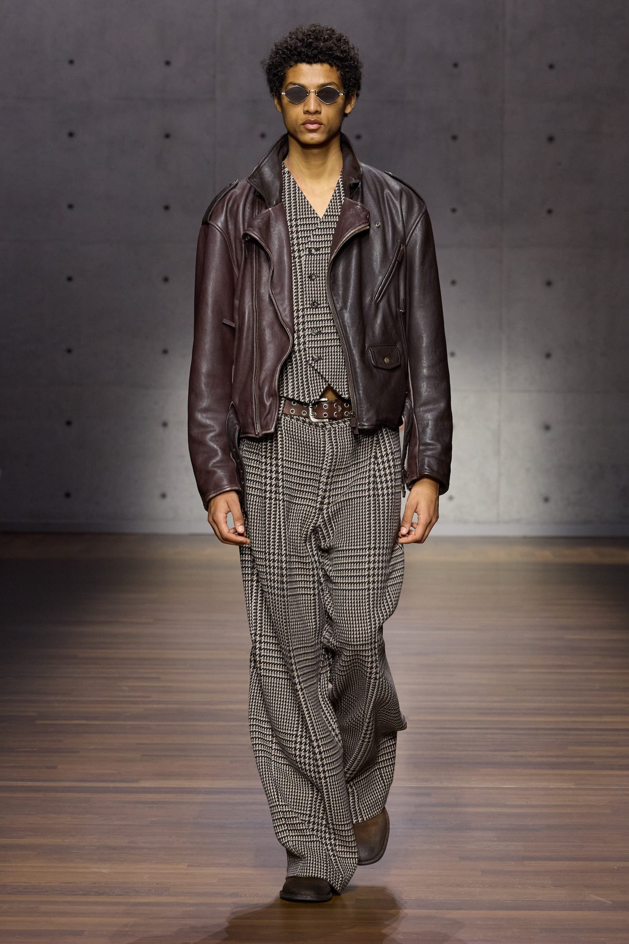 Completi oversize e decorati con fantasie principe di Galles, montoni crop e cappotti in pelle sfilano alla Milano Fashion Week sulla passerella Autunno/Inverno 2026-2027 di Emporio Armani.