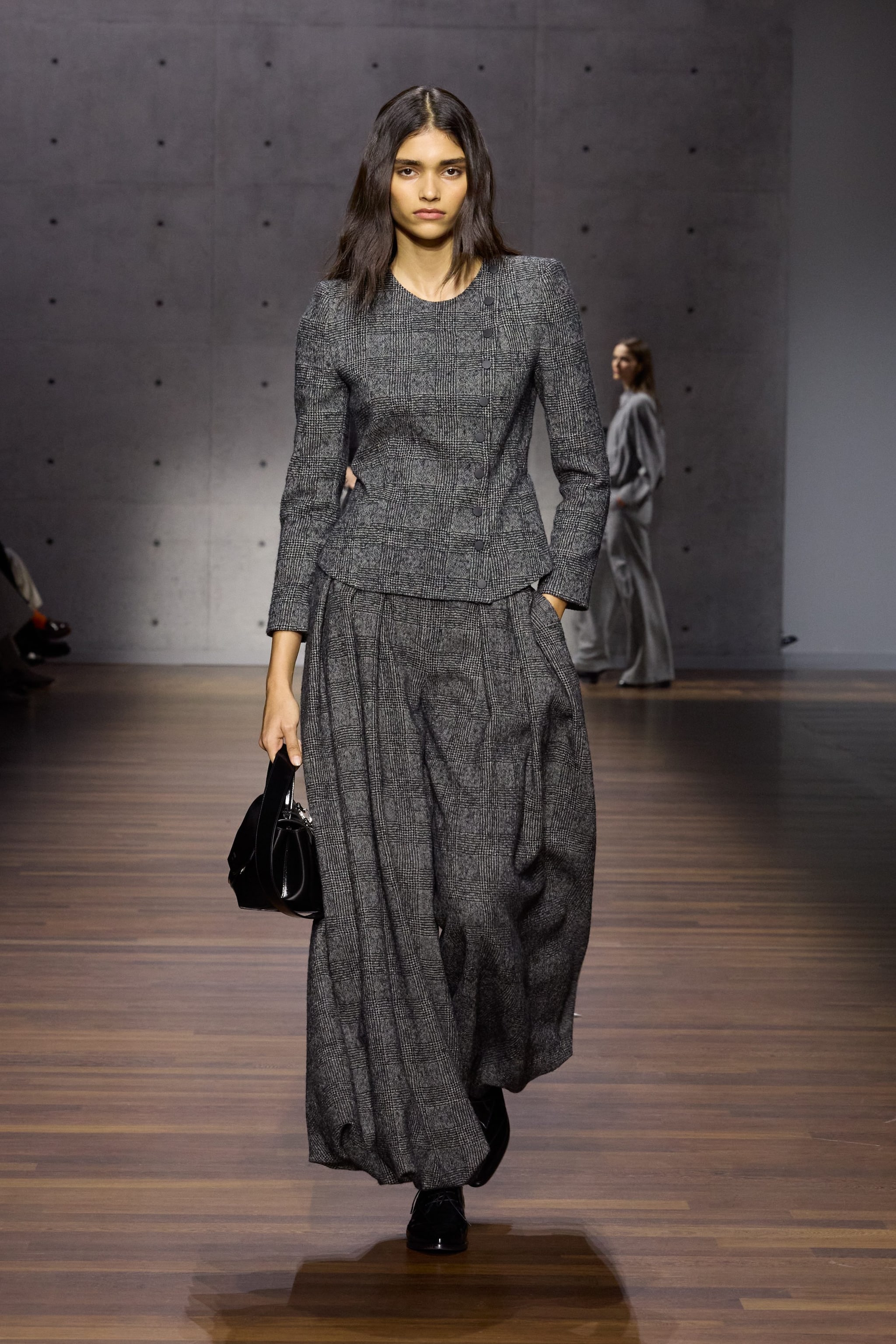 Completi oversize e decorati con fantasie principe di Galles, montoni crop e cappotti in pelle sfilano alla Milano Fashion Week sulla passerella Autunno/Inverno 2026-2027 di Emporio Armani.