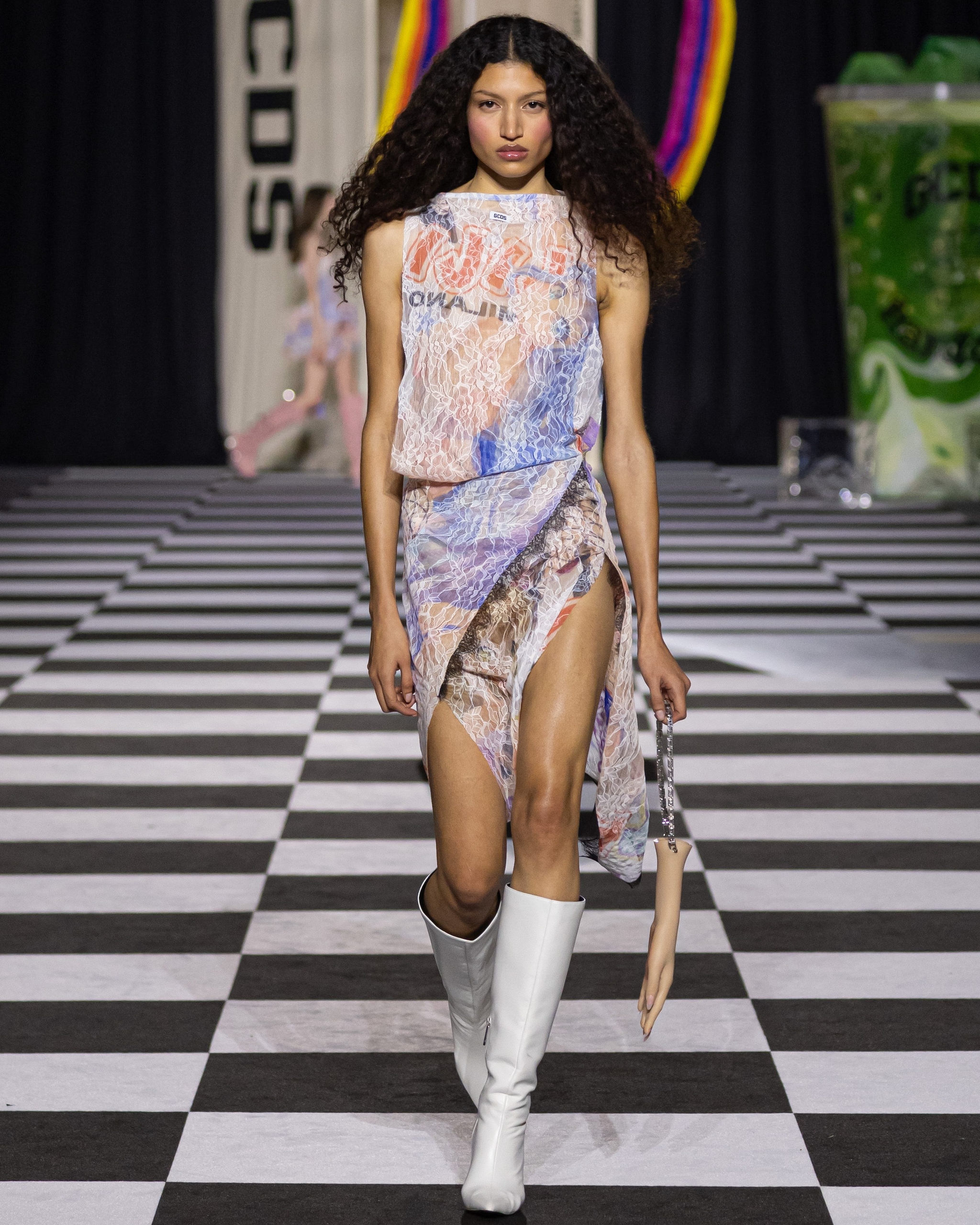 Mini abiti in seta con stampe pop, top a bustier colorati, completi floreali e capi a stampa pitone sfilano alla Milano Fashion Week sulla passerella Autunno/Inverno 2026-2027 di GCDS.