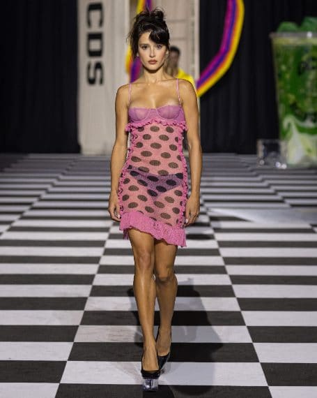 Mini abiti in seta con stampe pop, top a bustier colorati, completi floreali e capi a stampa pitone sfilano alla Milano Fashion Week sulla passerella Autunno/Inverno 2026-2027 di GCDS.