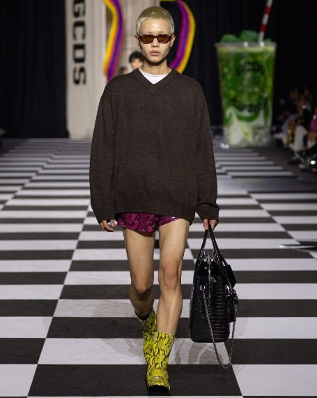 Mini abiti in seta con stampe pop, top a bustier colorati, completi floreali e capi a stampa pitone sfilano alla Milano Fashion Week sulla passerella Autunno/Inverno 2026-2027 di GCDS.