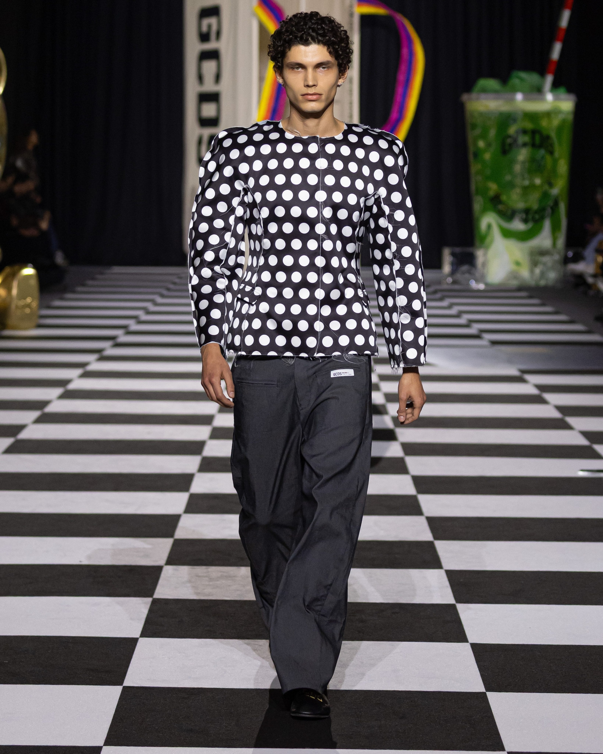 Mini abiti in seta con stampe pop, top a bustier colorati, completi floreali e capi a stampa pitone sfilano alla Milano Fashion Week sulla passerella Autunno/Inverno 2026-2027 di GCDS.