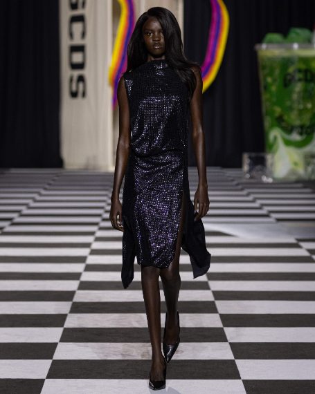 Mini abiti in seta con stampe pop, top a bustier colorati, completi floreali e capi a stampa pitone sfilano alla Milano Fashion Week sulla passerella Autunno/Inverno 2026-2027 di GCDS.