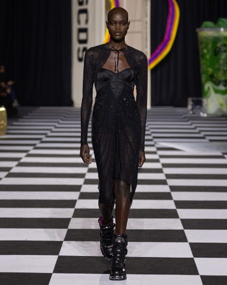 Mini abiti in seta con stampe pop, top a bustier colorati, completi floreali e capi a stampa pitone sfilano alla Milano Fashion Week sulla passerella Autunno/Inverno 2026-2027 di GCDS.